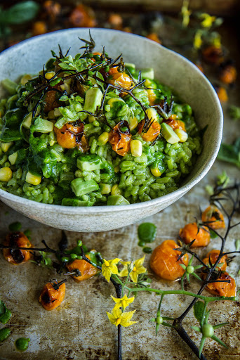 Roasted Tomato and Corn Risotto with Arugula Basil Pesto