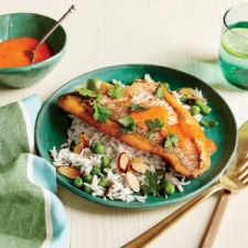 Slice a fresh lemon into paper-thin wheels and arrange in between fish fillets. Add about 2 TB warm canned chicken gravy to top of each piece of fish. Rub some dry minced parsley flakes between your fingers to a fine dust over each piece and add 1 or 2 slices of pimiento stuffed green olives to center of the piece, for garnish.