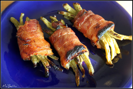 The only thing for me is that I baked them in a casserole dish, and the beans cooked in all that grease. Which may be the point, but the green beans absorb a lot of that grease, which obviously is not good for you. I think when (when, not if) I make them again, I'll cook them in a roasting pan, with the wire rack, so the beans still get the juices of the bacon while it's cooking, but a majority will drip down into the pan. That should also get the bacon crispier without having to broil it. (b/c I almost always burn everything I put under the broiler - see 1st pic)