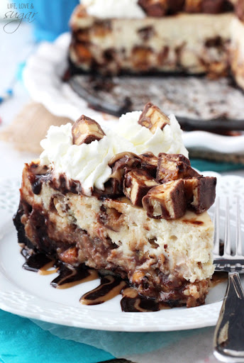 13. Remove springform pan sides from cheesecake and top with additional chocolate and caramel sauce, chopped mini Snickers and whipped cream.