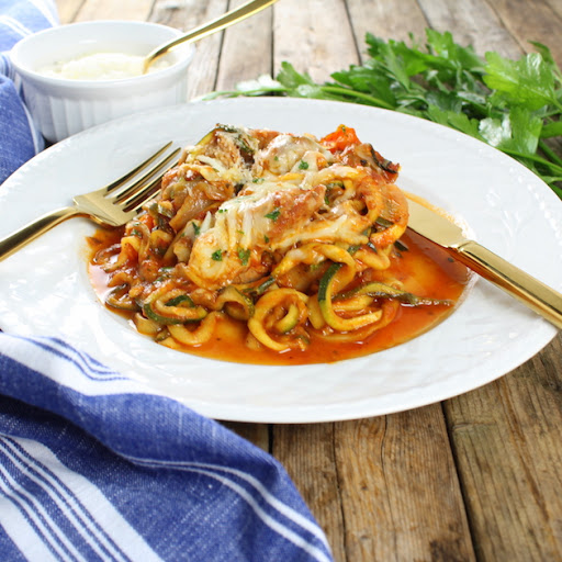 Sausage and Peppers with Zucchini Noodles & hearty pasta sauce - topped off with yummy melted blend of Mozzarella, Asiago, & Parmesan cheese.