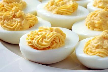 3. Fit pastry bag with large open-star tip. Fill bag with yolk mixture, twisting top of pastry bag to help push mixture toward tip of bag. Pipe yolk mixture into egg white halves, mounding filling about 1/2 inch above flat surface of whites. Serve at room temperature.