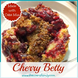 Next, slowly drizzle melted butter over the entire dish. There is no need to stir this dish. It’s best to layer these ingredients. As it bakes, the butter will creep through the cake mix and the cherry pie filling will bubble up. It’s a great example of teamwork.