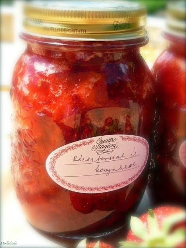 Wash strawberries and cut into little cubes, place in a pot and start to boil. When it releases its juice add crushed rose pepper, vanilla paste and most of the sugar, boil for about 10 minutes then add the the pectin combined with the rest of the sugar, boil vigorously for a further minute. Take off the heat and stir in the cognac. Pour in sterilized little jars (4 x 250 ml) close tightly and put upside down for 5 minutes.