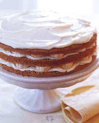 Beat at in half of the flour mixture at a lower speed until nearly combined, then the buttermilk, then the remaining flour mixture. Do not over mix. Mix in the extract. Fold in the bananas. Divide batter among 3 well greased 9 inch cake pans. Bake at350 degrees for 25-30 minutes. Let cool.