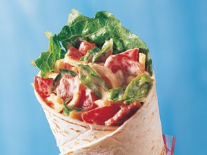 1. Toss all ingredients except tortillas. 2. Place lettuce mixture on tortillas. Fold up bottom third of each tortilla; roll up to form a cone shape with folded end at bottom.