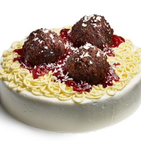 Arrange the cake balls on the cake. Mix the remaining frosting, the yellow food coloring and cocoa in a bowl; transfer to a pastry bag with a small round tip. Pipe the yellow frosting around the cake balls in a figure-eight motion to look like spaghetti.