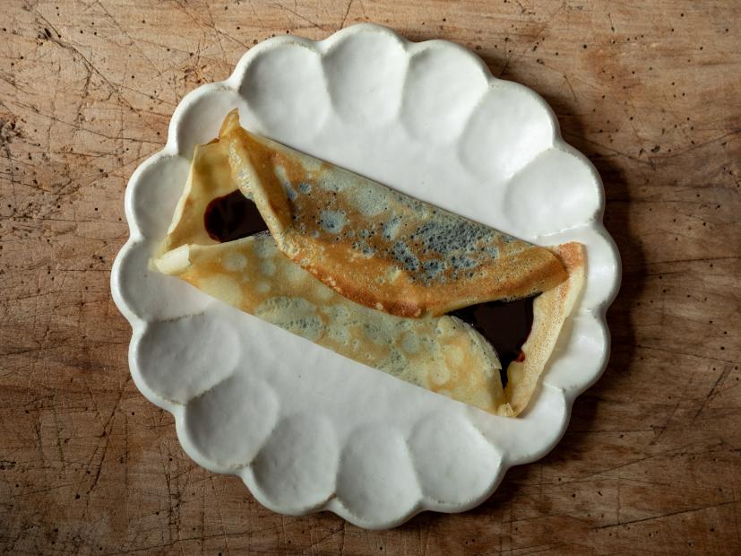 To make the crepes, spray an 8-inch saute pan with grapeseed oil spray, wipe it clean, and turn the heat to high. (You'll know the pan is ready when it just begins to smoke.) Using a 2-ounce ladle, ladle out crepe batter into the hot pan and tilt the pan to spread the batter into an even circle. After 45 seconds, when the top is dry, flip the crepe over and cook on the other side for 20 seconds, until it just starts to brown at the edges. Fold the crepe in half and transfer it to a sheet pan lined with foil. Repeat this process with the remaining crepe batter.