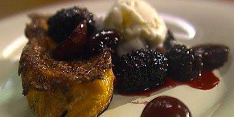 3. Divide the breads among serving plates. Serve hot with a scoop of vanilla ice-cream and a dribbling of fresh, ripe cherries and blackberries which has been sautéed in butter and sugar and possibly flamed.