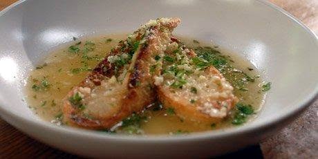 2. Season with salt and pepper. Lay the toasted bread in the bottom of two soup plates. Ladle over the stock. Sprinkle over the cheese and parsley, and serve hot.
