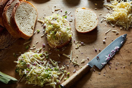 Gather a group of shallot, leek, scallions, and onion—as many members of the allium family as you have on hand—and chop them finely into a small heap. Add a minced clove of garlic. Grate a few generous handfuls of the best cheddar you can afford. (Montgomery is particularly appealing), set a little aside, and gently combine the rest with the onion mixture. Butter one side of thickly sliced bread and heap as much of the mixture as possible between the slices (butter facing in). Spread a thin layer of mayonnaise on the outside of the bread (this will keep it from scorching on the griddle). Press the reserved grated cheese to the outside of the bread, where it will create a wonderfully crisp and shaggy crust, giving your sandwich an entirely new dimension. (For less mess, it helps to apply the mayonnaise and cheese first on one side only, lay that side on the griddle, then quickly do the remaining top side while the bottom is sizzling.) Fry on a heated nonstick griddle or in a nonstick skillet about 4 minutes a side, until the cheese is softly melted.