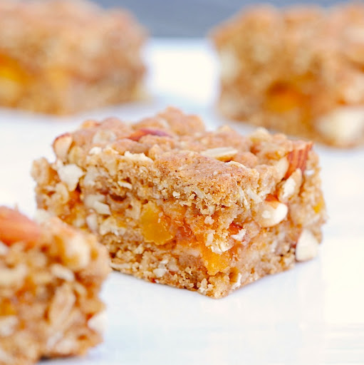These chewy fruity apricot oat bars are sweet and satisfying, with chopped walnuts, cinnamon, brown sugar, and vanilla contributing to their complex flavor.