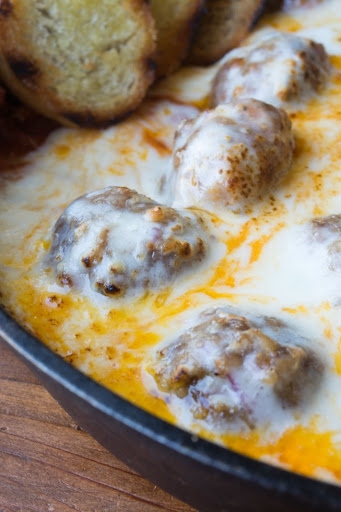 After you put the meatballs in the oven, pour the sauce into a 10 inch cast iron skillet and place in the oven along with the meatballs for the last 10 minutes of cooking, to heat up the sauce.