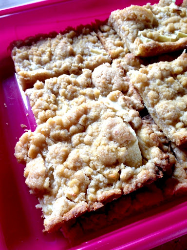 - Place apples on top and for the streusel mix all ingredients and crumble them on apples.