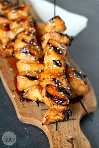 Using a grill brush, brush oil onto grill racks to prevent sticking {could also use grill spray}. Place the skewers onto the grill, close grill. Grill over medium high heat, and occasionally brush the chicken with the reserved sauce mixture. Close grill between brushing. Cook for 4-5 minutes on first side, flip and cook another 4-5 minutes on second side.