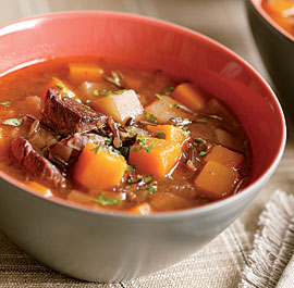 In a Dutch oven or heavy soup pot, melt the butter or bacon fat over medium-high heat. Season the beef generously with salt and pepper. Put the beef in the pan in a single layer; don’t stir for about 1-1/2 minutes. Then stir occasionally until the meat is well browned on all sides, about 5 minutes. With a slotted spoon, transfer the meat to a plate.