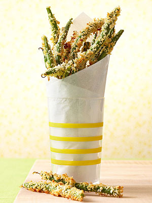 1. Preheat oven to 450 degrees F. Coat a 15x10x1-inch baking pan with the 2 teaspoons oil; set aside. 2. In a large bowl combine the flour and 1/8 teaspoon of the salt. Add green beans and toss to coat. 3. In a shallow dish combine the panko and remaining 1/8 teaspoon salt. In another shallow dish place the eggs. A few at a time, dip green beans in the eggs to coat, then roll in panko to coat (tip: to prevent the crumbs from getting to wet, work with half of the panko at a time). 4. Arrange beans in a single layer in the prepared pan. Drizzle with sesame oil. Bake for 10 to 12 minutes or until golden.