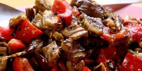 2. If grilling, grill eggplant slices and pepper quarters (without brushing with oil) until lightly charred, but still moderately firm, turning occasionally. Remove from heat into a bowl and cover with plastic (this will continue to soften the vegetables).