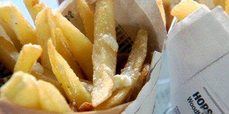 3. Add half the potatoes and cook until tender, about 5 minutes – the fries will not brown at this point. Remove fries with a slotted spoon onto a paper towel-lined tray and repeat with other half. Fries at this point can be chilled until ready to cook and serve.