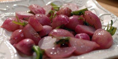 1. Put radishes in a sauté pan just large enough to hold them. Add enough water just to cover, and season with salt and pepper. Boil until tender, by which time the water should be nearly gone. Add a knob of butter, and a cube or two of sugar. Cook a minute or two until the sugar melts and the radishes become glazed