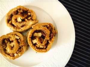 Roll pastry dough into rectangle 20X16. Spread with apples mixed with 2 Tbsp. sugar & 1 Tbsp. flour & cinnamon. Roll jelly roll style & cut into 12 pieces about 1 1/2 " wide. Place over dissolved sugar and butter mixture.
