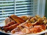 Take the giblets out of the turkey and wash the turkey inside and out. Remove any excess fat and leftover pinfeathers and pat the outside dry. Place the turkey in a large roasting pan. Liberally salt and pepper the inside of the turkey cavity. Stuff the cavity with the thyme, lemon, 1 onion, quartered, and the garlic. Brush the outside of the turkey with the butter and sprinkle again with salt and pepper. Tie the legs together with string and tuck the wing tips under the body of the turkey. Peel and slice the remaining onions, toss them with olive oil, and scatter them around the turkey.