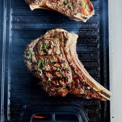 the steaks on their fatty edges (bone side up) and cook over moderate heat until the fat has started to render and is lightly charred, 5 minutes. Lay the steaks flat. Grill, turning often, until an instant-read thermometer inserted in the thickest part registers 120°, 12 to 15 minutes. If using a grill pan, carefully blot excess fat with paper towels