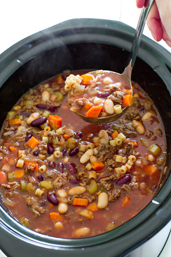 2. Place the beef in a slow cooker along with the rest of the ingredients except for the beans and pasta