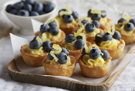 Spoon the lemon curd into the pastry cups. Top each with 3 blueberries and a bit of candied lemon zest and serve immediately.