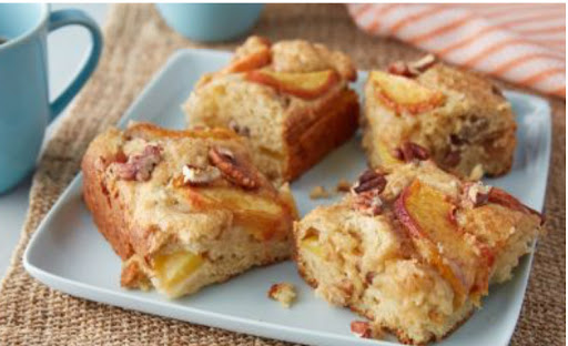Spread half of the batter evenly in the pan. Top with half of the peaches, then sprinkle with two-thirds of the sugar mixture. Spread the remaining batter on top, arrange the remaining peaches on top, and sprinkle with the remaining sugar mixture and the pecans.