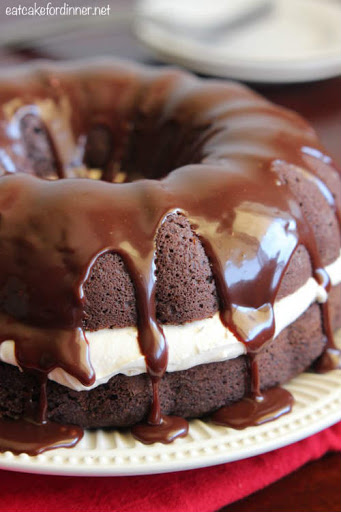 Preheat oven to 350 degrees. For the Cake: Grease and flour a 12-cup bundt pan; set aside. In a large bowl, combine the dry cake mix, dry pudding mix, water, oil, eggs, sour cream and vanilla. Using a hand mixer, mix until all ingredients are completely incorporated and mixture is smooth. Pour batter into the prepared bundt pan and spread out evenly. It is a very thick batter. Bake for 45 minutes or until a toothpick inserted in the center comes out clean. Remove from oven and cool in pan for 10 minutes, then invert to a wire rack and cool completely. Once cake is cool, slice in half horizontally.