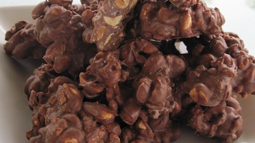 In a medium heat-proof bowl, melt together the chocolate chips and condensed milk in the microwave. If you do not have a microwave, use a metal bowl over the top of a pan of simmering water. Stir frequently until melted and smooth. Stir in the nuts and rice cereal until well blended. Drop by rounded spoonfuls onto waxed paper. Chill 2 hours to set.