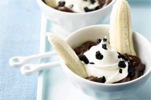 SPOON pudding into 2 small bowls. Insert bananas in pudding.
