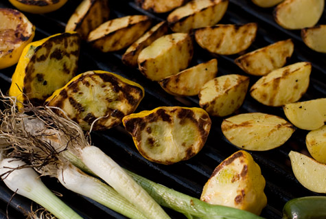 Toss the potato wedges, squash, and green onions with a bit of olive oil and a pinch of salt. Place them on a medium-hot grill. Place the lemons on the grill as well, cut side down. Grill for 10-20 minutes or until golden and cooked through - moving around the grill if needed and flipping to get color on all sides. The squash will likely cook faster than the potatoes, remove pieces and place on a platter when they are done grilling.