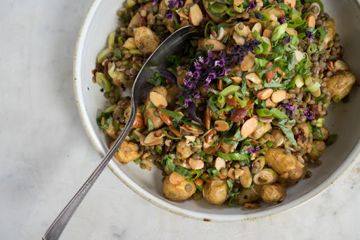 In a large bowl, toss the lentils with the sun-dried tomatoes, sun-dried tomato oil, ginger, sea salt, garlic, most of the scallions, and lemon juice. Toss well. Add the potatoes and gently toss again. Top with the remaining scallions, the almonds, and basil.