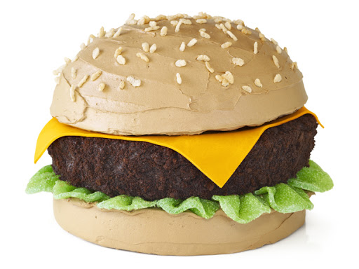 Assemble the burger: Put the chocolate patty on the bottom bun, then drape the orange fondant on top. Frost the bowl-shaped cake with the remaining light brown frosting; place on the patty. Press the rice cereal into the frosting.