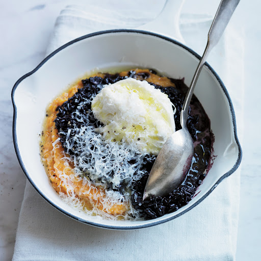 Spoon the squash puree into shallow bowls, then spoon the risotto on top and garnish with the burrata. Top with a sprinkle of flaky sea salt and a drizzle of olive oil and serve. Pass additional cheese at the table.