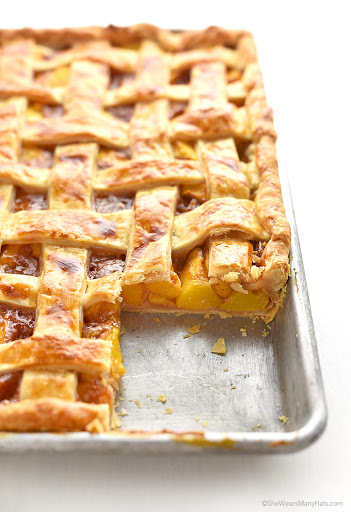 Fit one piece of pastry dough into an ungreased 9x13x1-inch sheet pan (quarter sheet pan). Allow access overhang. Do not trim. Pour peach filling into crust and spread evenly.