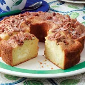 In a small bowl, beat the cream cheese, confectioners' sugar and lemon juice until smooth. Spoon half of the batter into a greased and floured 10-in. tube pan. Top with filling and remaining batter. Combine topping ingredients; sprinkle over batter.
