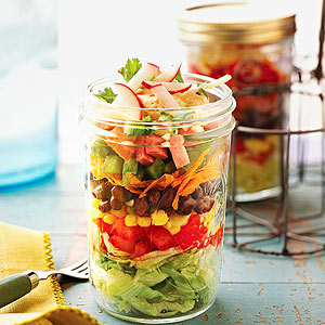 Place 3 cups of the lettuce in the bottom of a 3-quart clear salad bowl (or divide it among eight bowls or jars). Layer ingredients in the following order: black beans, tomatoes, frozen corn, sweet pepper, carrot, remaining lettuce, ham, green onions and cheese.