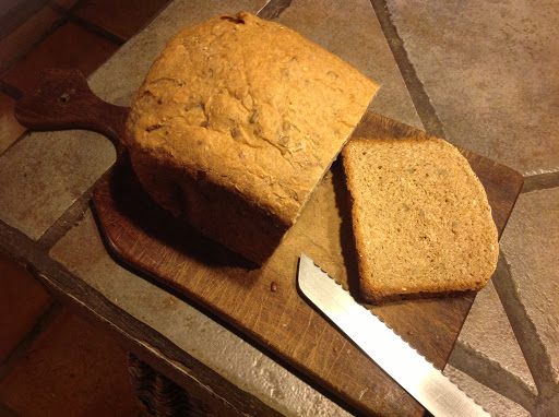 A delicious whole wheat bread made easy in the bread machine. We love the hearty taste and texture from the added sunflower seeds and/or grain cereal (crunchy hippy bits affectionately know as "stix and weeds" in my house) My husband gave me a flour mill as a gift, I LOVE IT! I can now mill my own fresh whole wheat flour. SOOOO good. Makes me sound like an over-achiever, BUT I am NOT. Just lucky. An electric mill is no more complicated than a giant coffee grinder! Whole wheat goes in, out pops the freshest, nuttiest, healthiest flour! So tasty and much better for you! You can use store bought whole wheat flour with a good result too. Adding the vital gluten is important to make the loaf rise higher, you can omit it.. but the loaf is much more dense. Thanks honey! This bread is YUMMY! Can be made vegan.