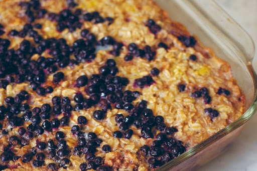 Arrange the bananas in a single layer in the bottom of the prepared baking dish. Sprinkle two-thirds of the berries over the top. Cover the fruit with the oat mixture. Slowly drizzle the milk mixture over the oats. Gently give the baking dish a couple thwacks on the countertop to make sure the milk moves through the oats. Scatter the remaining berries and remaining walnuts across the top.