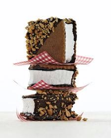 4.Cut out nine 2 1/2-inch square marshmallows using a cookie cutter or a knife dipped in confectioners' sugar. Dip surface of crackers into chocolate to coat, and transfer to parchment-lined baking sheets. Refrigerate until set, about 10 minutes. Sandwich marshmallows between crackers, chocolate sides in.