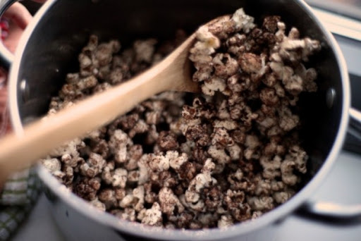 5. While the popcorn is still hot, pour the mixture from step 1 and mix with a spoon until all kernels are thoroughly coated.