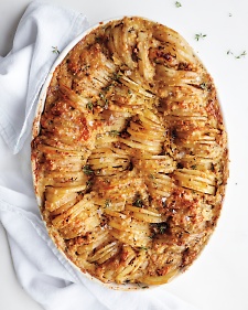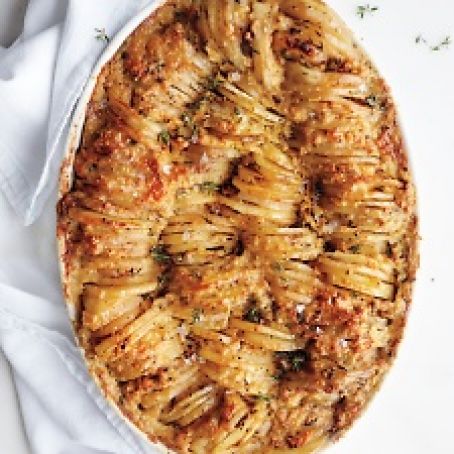 Oil a 2 1/2-quart baking dish and sprinkle bottom with some of the salt-and-pepper mixture. Cut potatoes into 1/8-inch thick slices with a handheld slicer or knife. Arrange slices vertically in baking dish; wedge in shallots and sprinkle thyme throughout. Brush with oil and season between potato slices with remaining salt-and-pepper mixture. Place baking dish on a rimmed baking sheet.