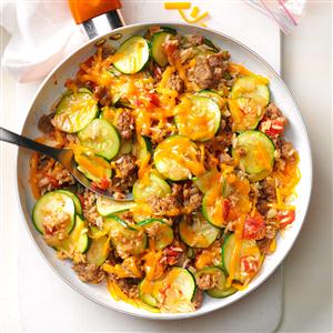 In same pan, heat oil over medium heat. Add zucchini and onion; cook and stir 5-7 minutes or until tender. Stir in sausage, tomatoes, rice, mustard, garlic salt and pepper. Bring to a boil. Reduce heat; simmer, covered, 5 minutes to allow flavors to blend.
