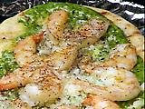 Preheat the grill to medium-high. Once the dough has risen, divide it in half, and set aside half for another use or for the Red Chile-White Anchovy Caesar Salad Pizza. Then divide the half into 4 balls. Roll each ball into 8-inch circles. Brush each circle with oil and grill on both sides until golden brown. Add 1/2 cup grated cheese to each pizza and grill until the cheese is just melted. Remove from the grill and spread a few tablespoons of the cilantro pesto over each pizza. Top each pizza with 4 shrimp and sprinkle with cilantro leaves.