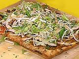 Form pizza crust on pizza pan or cookie sheet. Top with duck or plum sauce - spread it around like you would pizza sauce. Sprinkle the pizza with some crushed red pepper flakes then top with cheese and peppers. Bake until golden and bubbly, 15 to 17 minutes.