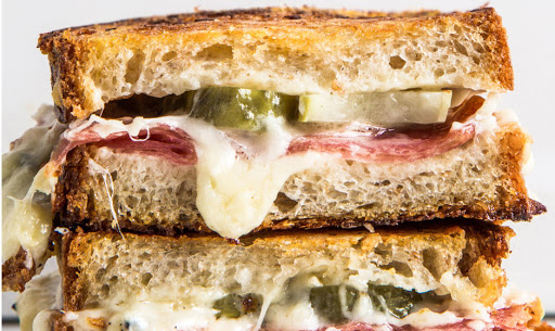 Divide half of cheese among 4 slices of bread. Top with pickles, salami, and remaining cheese. Close sandwiches and spread half of butter evenly over top of bread slices.