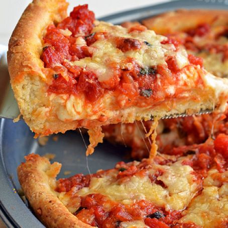 Recipe Note: This recipe is for one 9-inch deep dish pizza, whereas the original is for two. I altered some of the steps as I found I didn’t need as much time for kneading the dough, cooking the sauce, or baking the pizza. These changes are reflected in my version above. If you double this recipe, your times may increase significantly for cooking the sauce, and slightly for kneading and baking.